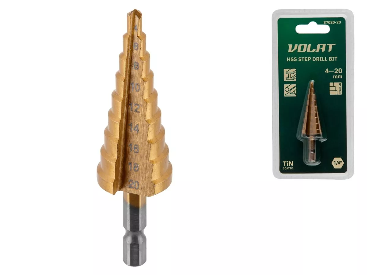 Сверло по металлу ступенчатое 4-20 мм HSS TIN ВОЛАТ, арт.87020-20